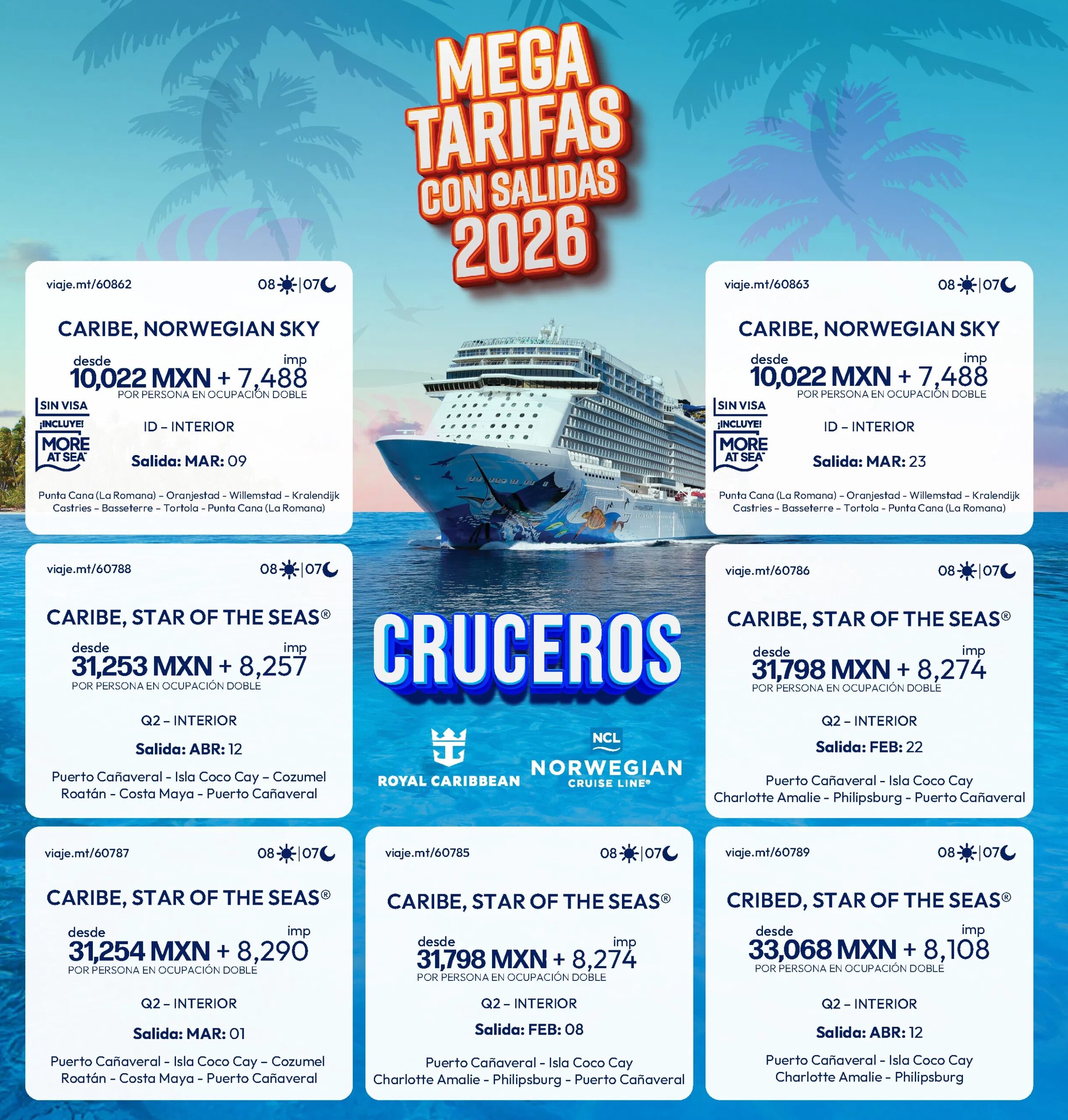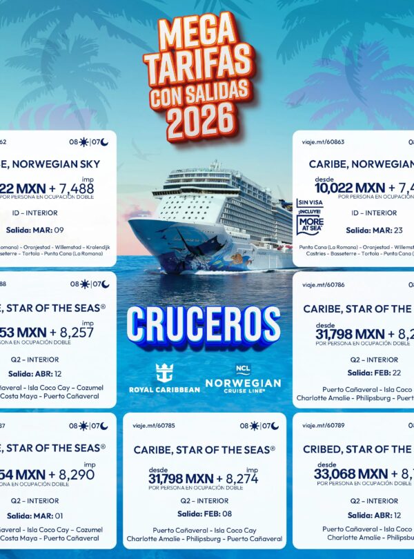 - Acceso a las áreas públicas del barco (albercas, casino, canchas deportivas, tiendas, biblioteca, teatro, cine, disco y bares).