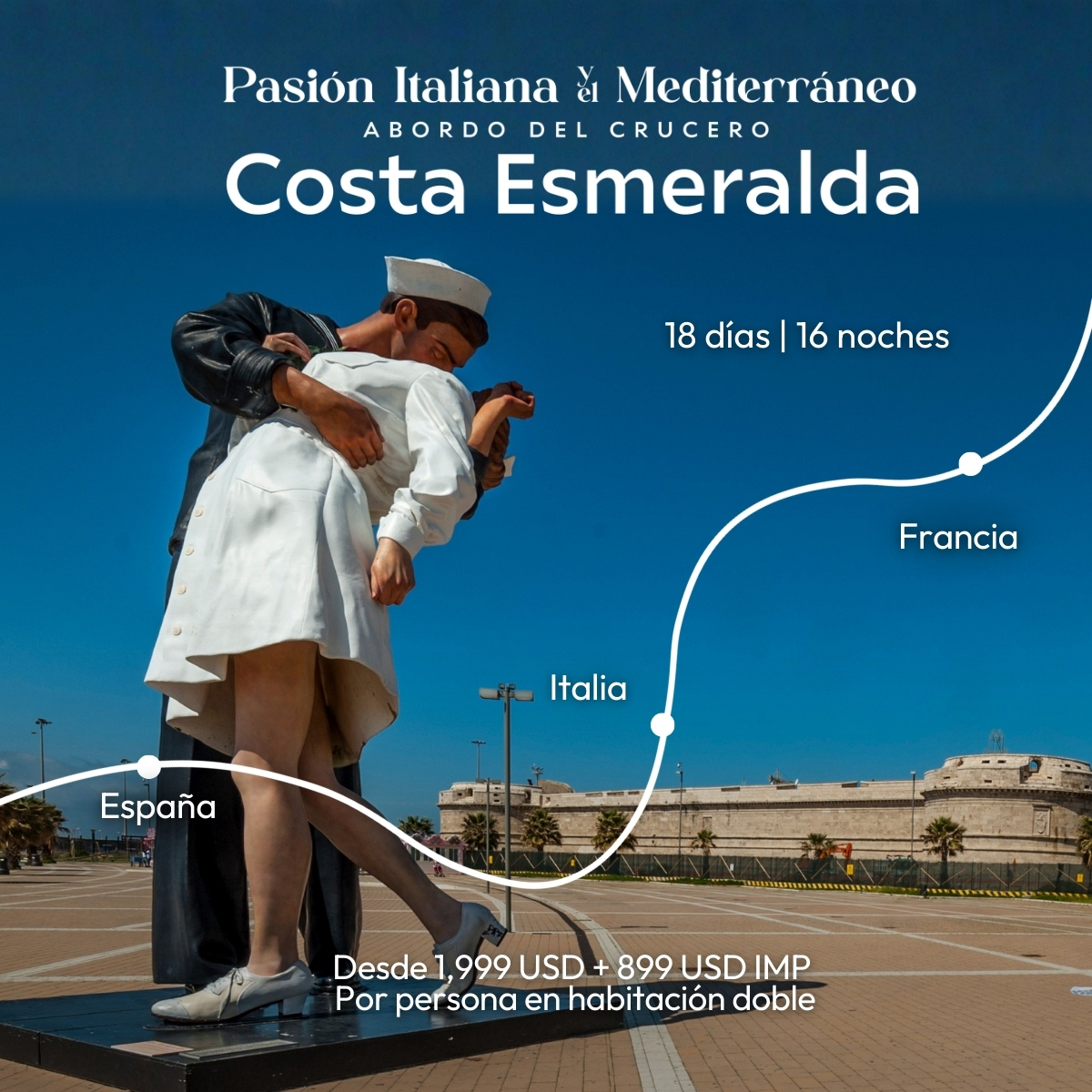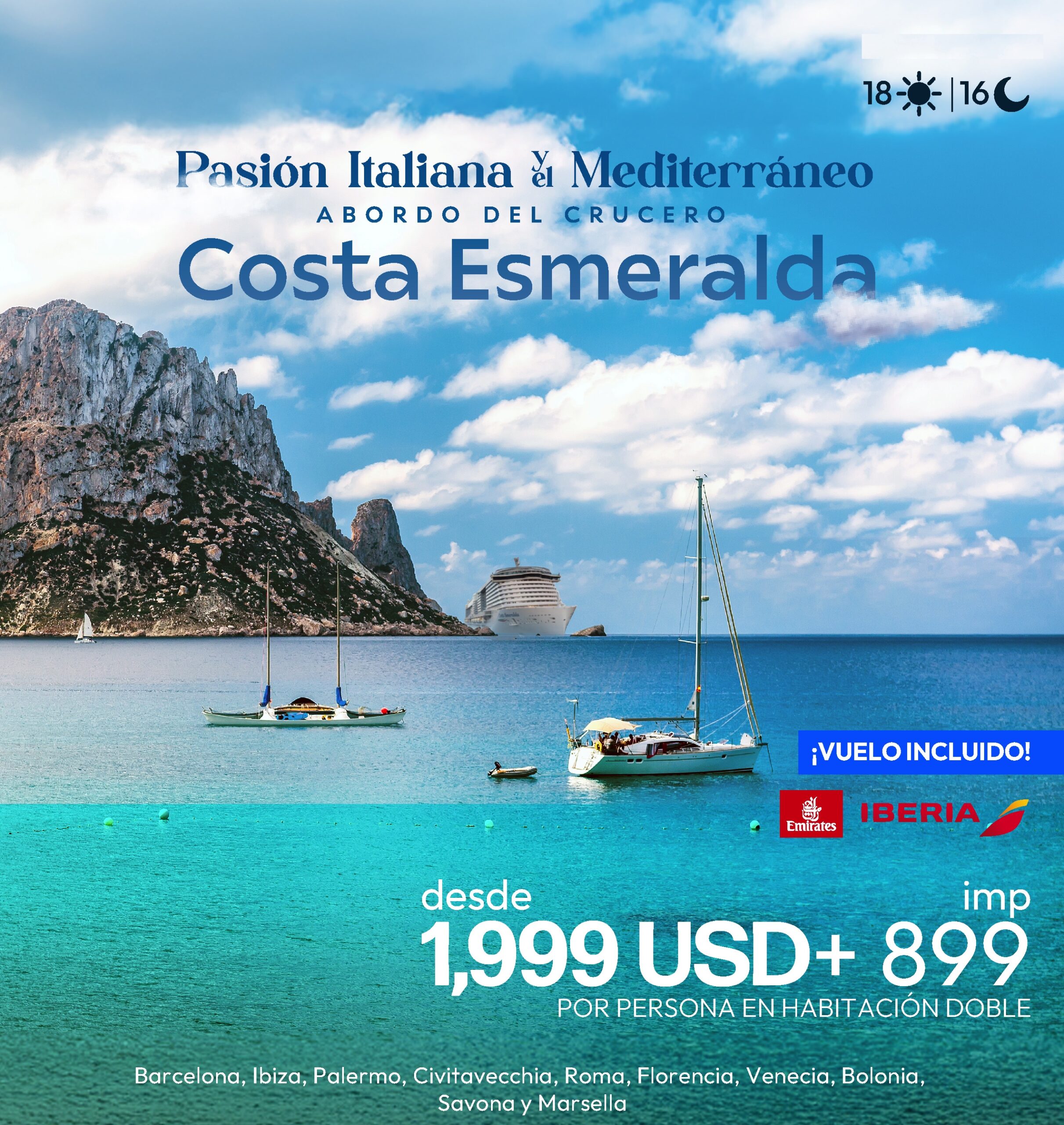 Barcelona, Ibiza, Palermo, Civitavecchia, Roma, Florencia, Venecia, Bolonia, Savona, Marsella