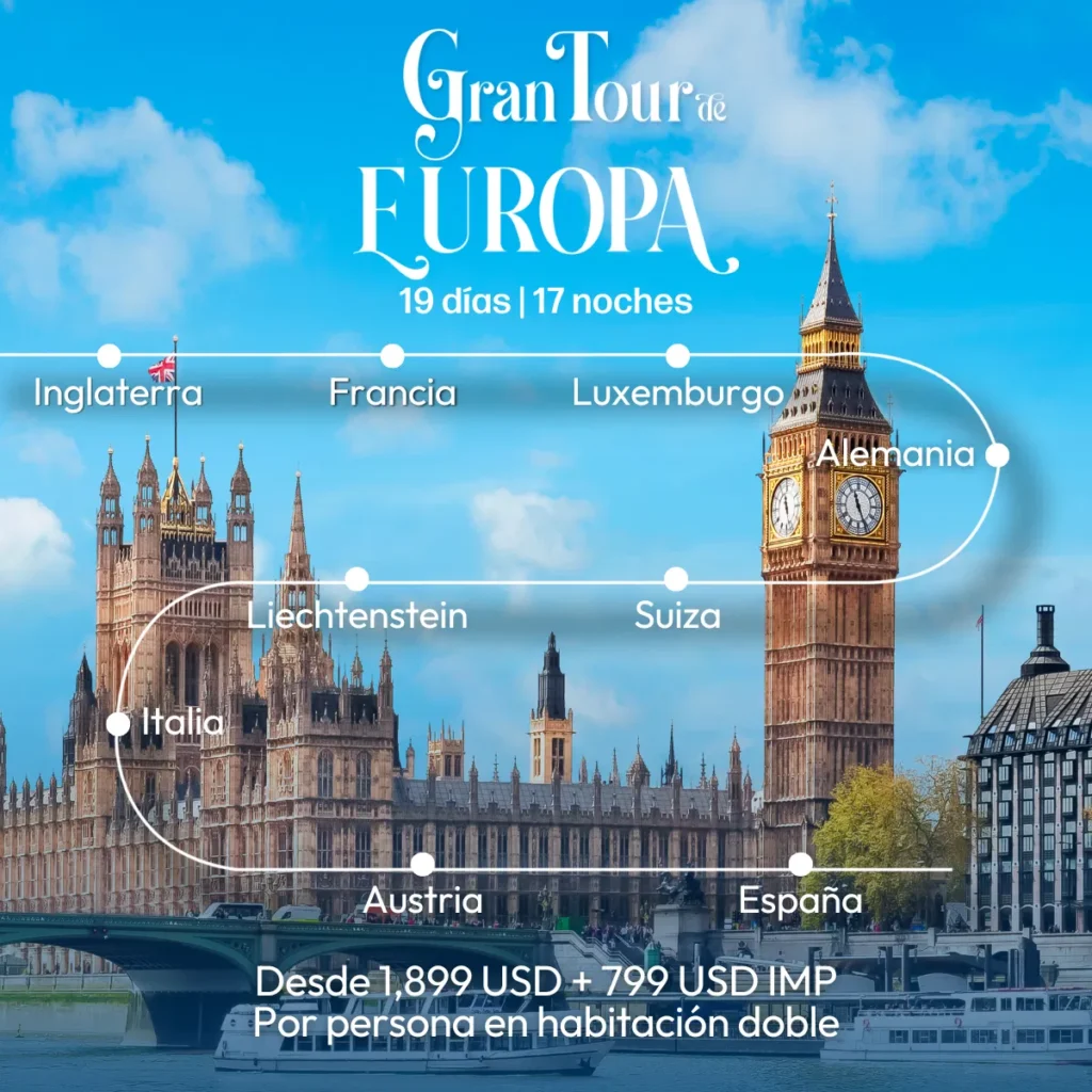 Gran Tour de Europa¡INCLUYE VUELO! Visitando Inglaterra,Francia,Luxemburgo,Alemania,Suiza,Austria,Italia,EspañaLondres, París, Luxemburgo, Frankfurt, Heidelberg, Zúrich, Lucerna, Vaduz, Innsbruck, Padua, Venecia, Florencia, Roma, Pisa, Niza, Barcelona, Zaragoza, Madrid